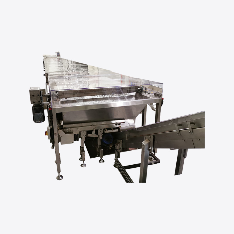 The whole production line of the chocolate chunks-making machine is fully automatic, with a clear structure. The chocolate pulp is directly fed by the temperature-regulating machine. The chocolate pouring machine is poured on the conveyor belt and then enters the cooling tunnel, and finally, the finished product is discharged in sections.