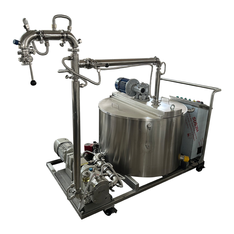 Gusu Machinery's chocolate paste supply system consists of a storage tank and a delivery pump. Capacities of 100L and 300L are available, and customization is also supported. Primarily used for storing and transporting chocolate paste, it is a key piece of equipment in a chocolate production line. The system features casters at the bottom for easy movement. Its main functions include paste heating, conveying, anti-coagulation, and precise feeding.