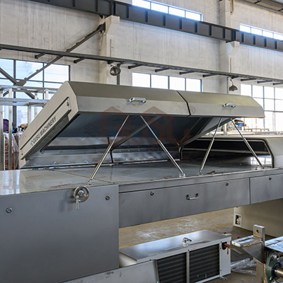 Cooling tunnels are suitable for cooling various snack foods during molding, such as candies and chocolate products. They can be configured after a chocolate enrober. After the product is coated with chocolate slurry, it is conveyed by a conveyor belt into the cooling tunnel for cooling, allowing the chocolate slurry to solidify on the product surface. The cooling tunnel can be matched to the output of the preceding chocolate enrober. The machine has a compact structure and stable operation.